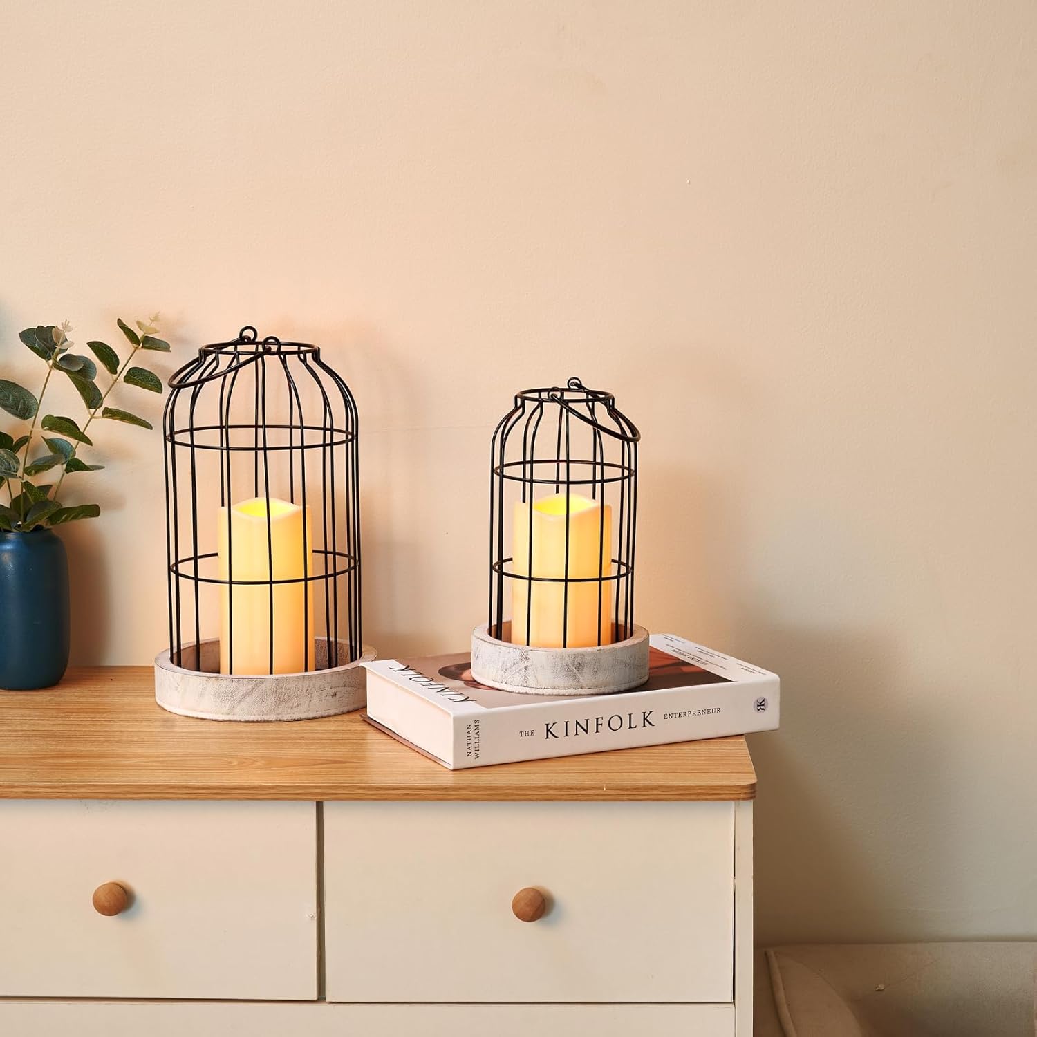 - VERSATILE CANDLE LANTERN: Featuring a white washed finish and birdcage design, this vintage lantern set of 2 is perfect for year-round decorating. Use this lantern candle holder set to display your favorite pillar candles, fake plants, flowers, succulents, fairy lights and other seasonal and holiday elements to create a rustic centerpiece.