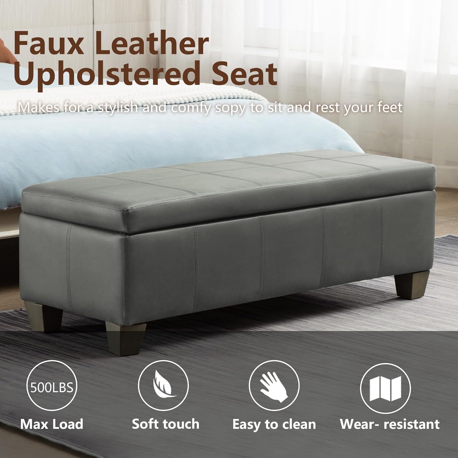 - HIGH QUALITY FABRIC: The end of bed storage bench is made of artificial leather and is purely hand-sewn. The fabric is durable and not easy to wear, has no odor and is easier to clean. Plenty of foam padding and fine leather is soft and comfortable to sit on.