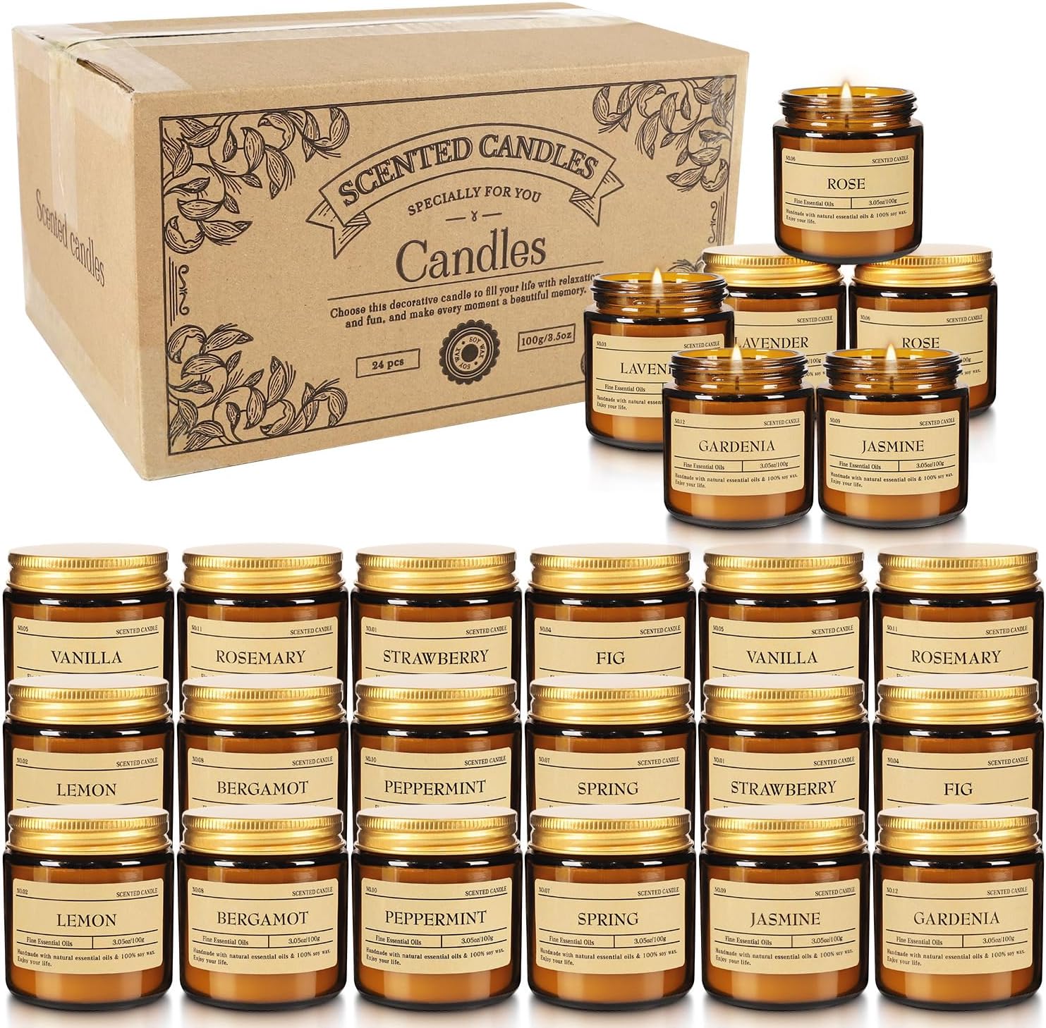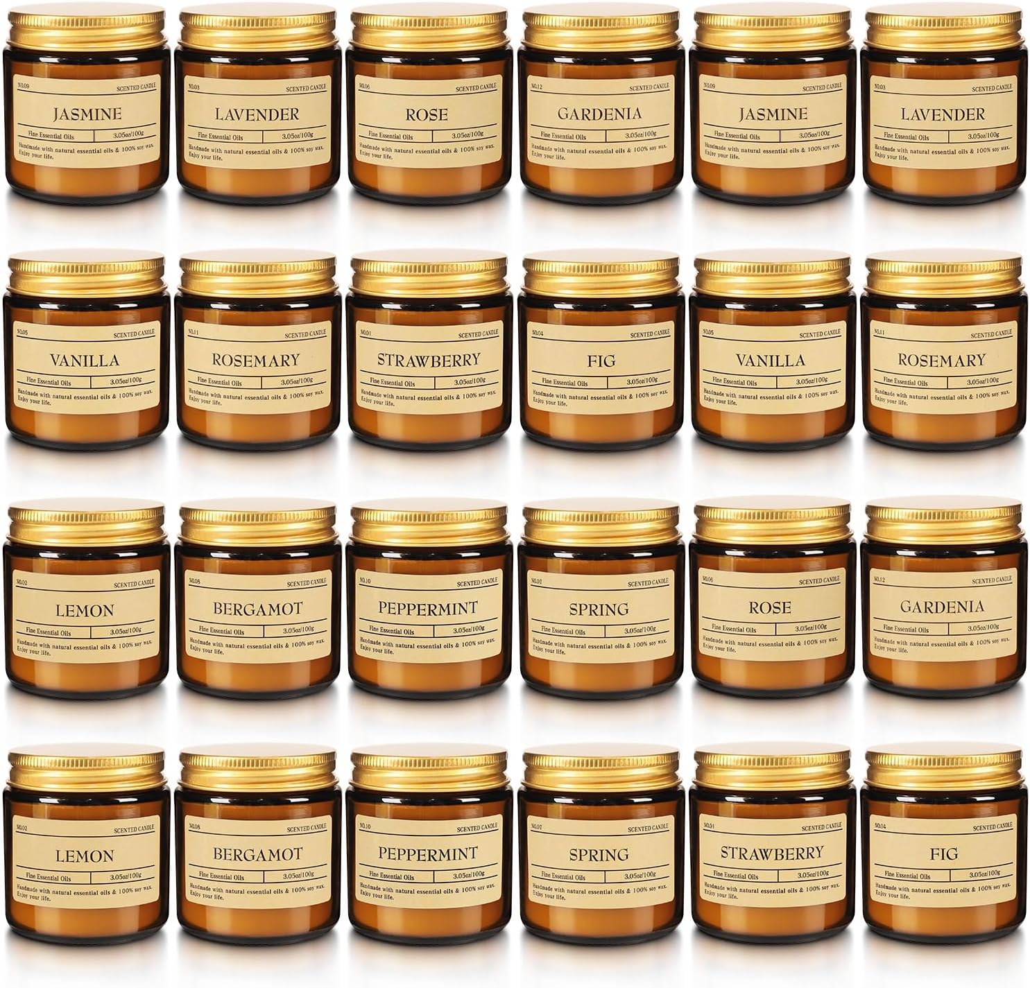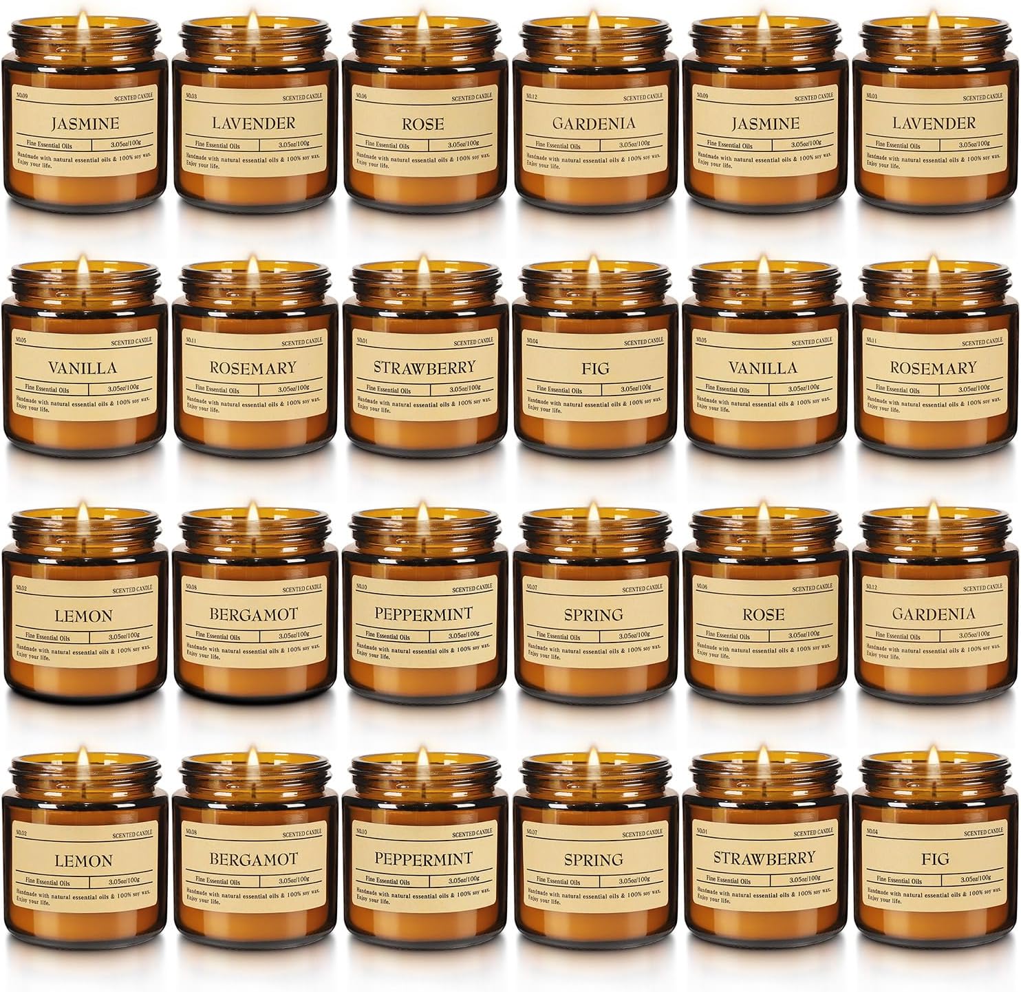 - Variety of Scents:This 24-pack scented candle set offers a variety of scents such as lemon, jasmine,Lavender, Rose,Gardenia,vanilla,rosemary,strawberry,fig,spring,peppermint,bergamot,satisfying your different needs for aroma.