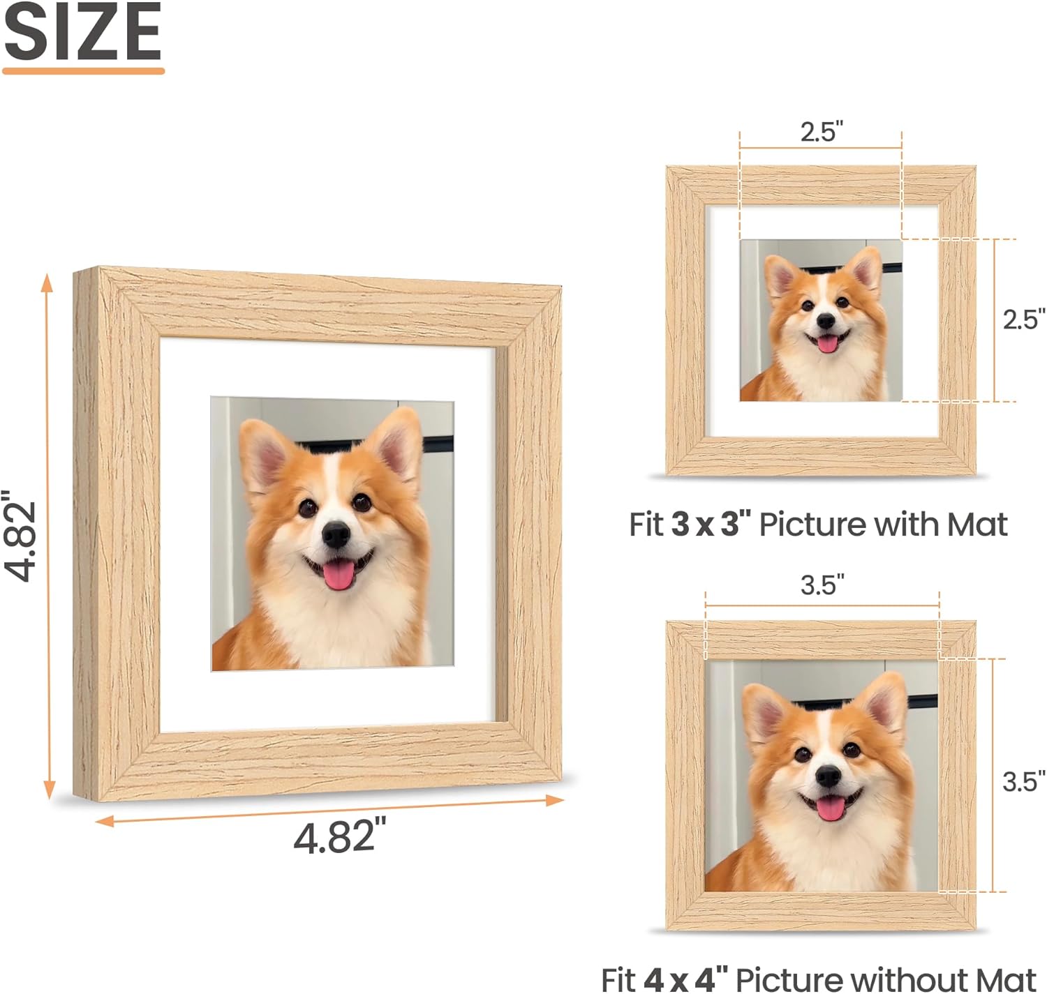 - Sizes Attention: The display size will be 0.5inch smaller than the photo size to better stable the photo and prevent it from falling off. The actual display size is 2.5x2.5 inch with mat and 3.5x3.5 inch without mat.