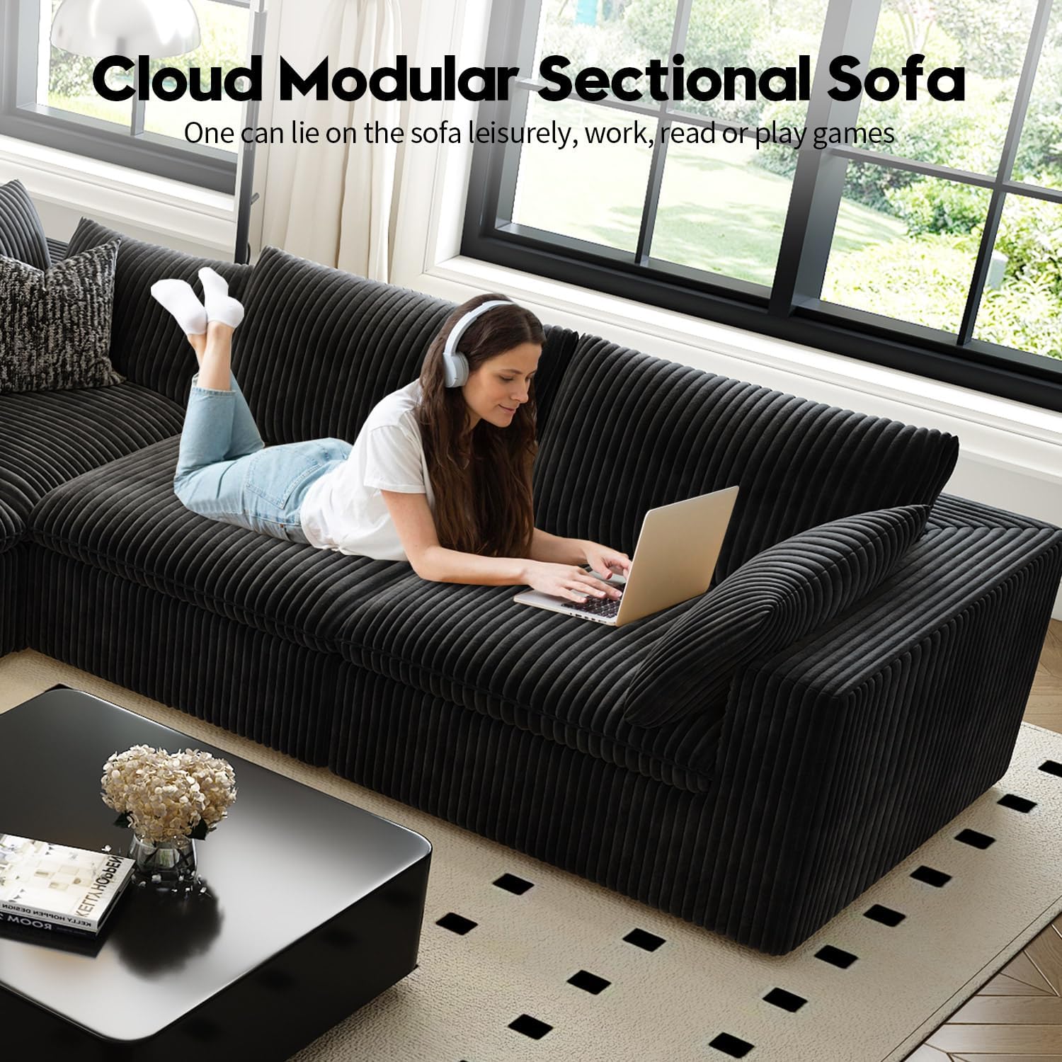 118" Cloud Couch Oversized Modular Sectional Sofa for Living Room,Modern Sofa with Deep Seat,V Shaped Boneless Couch,Comfy Upholstered Corduroy Couches for Apartment, Studio, Office,Bedroom,Black