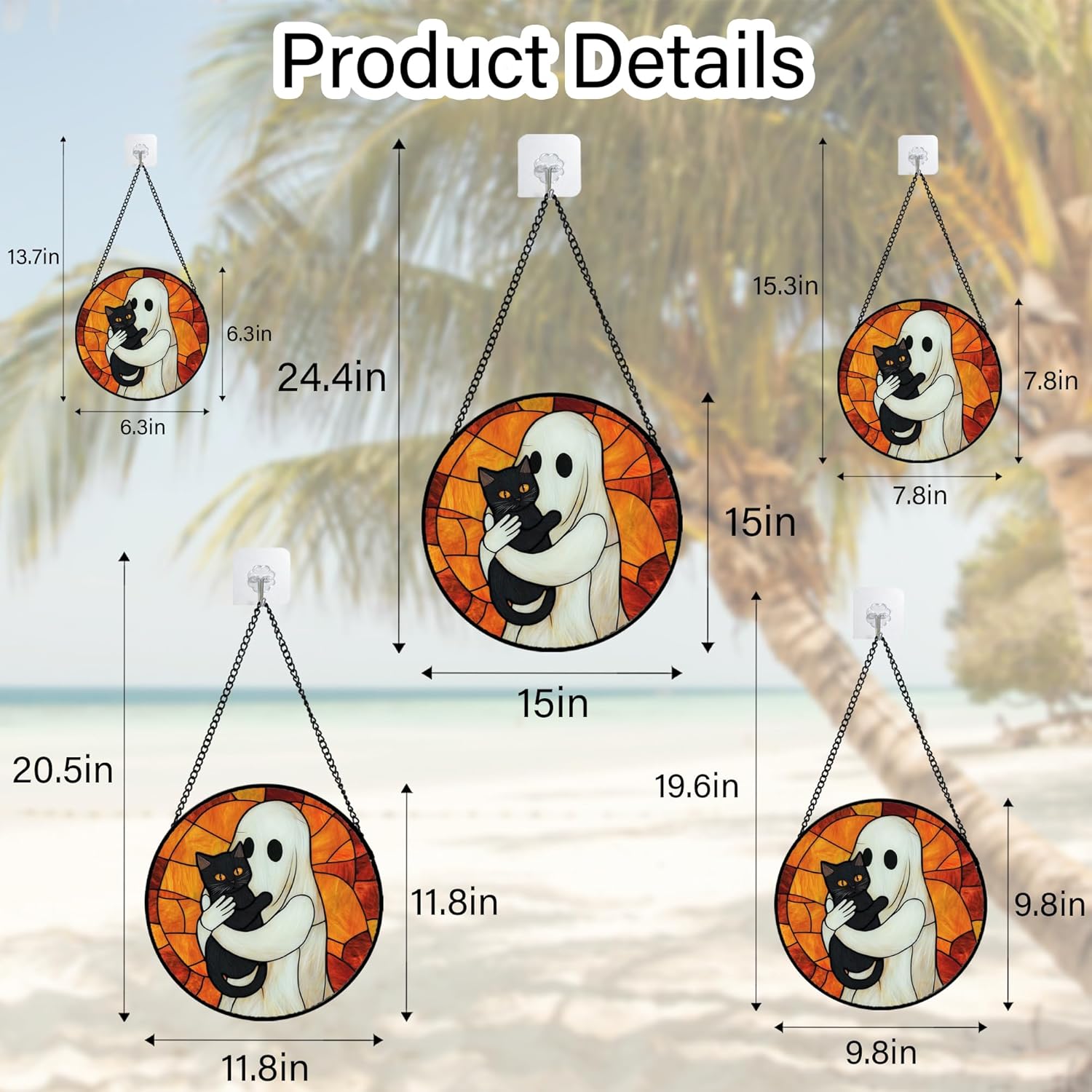 Stained Glass Window Hanging - Halloween Decorations White Ghost Black Cat Suncatcher for Doors Garden Spooky Funny Orange Sun Catchers Gothic Decor Horror Gifts for Women Men Friend 9.8 in
