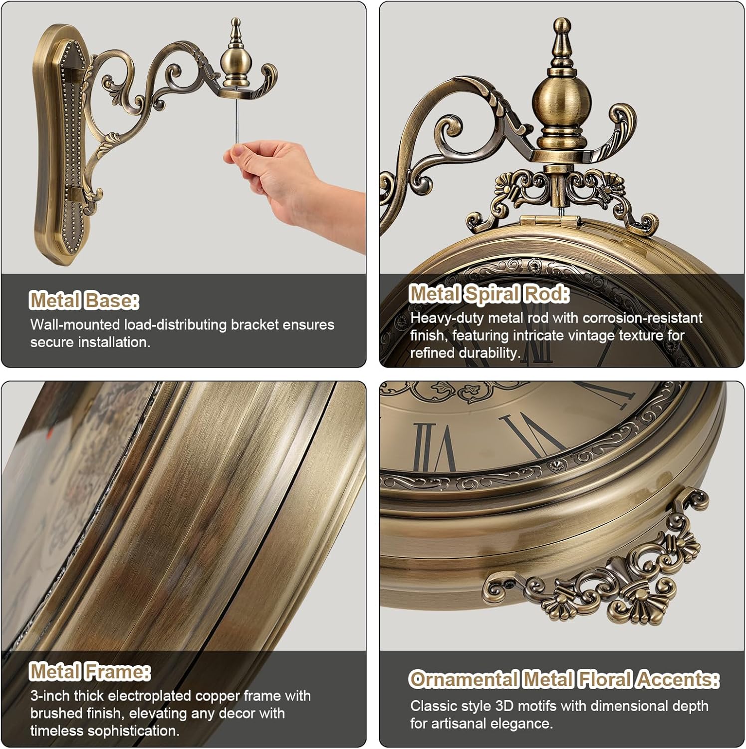 - āļø [Premium All-Metal & Glass Construction] Experience unmatched durability and sophistication. Meticulously crafted from solid metal and glass, this wall clock features a robust bronze frame enhanced by a hand-polished, brushed copper plating finish. The glass-covered faces protect the elegant dials, ensuring this antique clock remains a timeless piece of functional art.