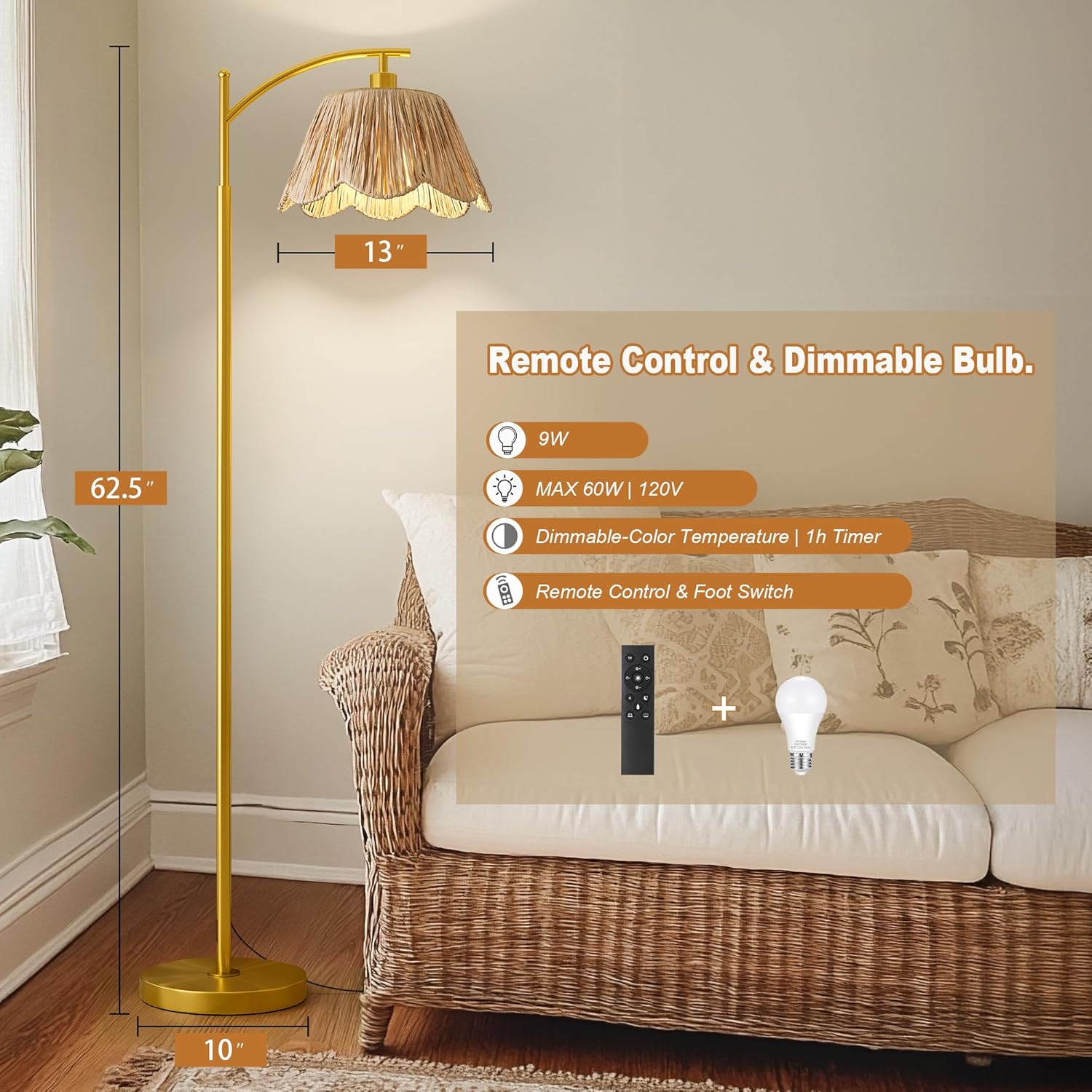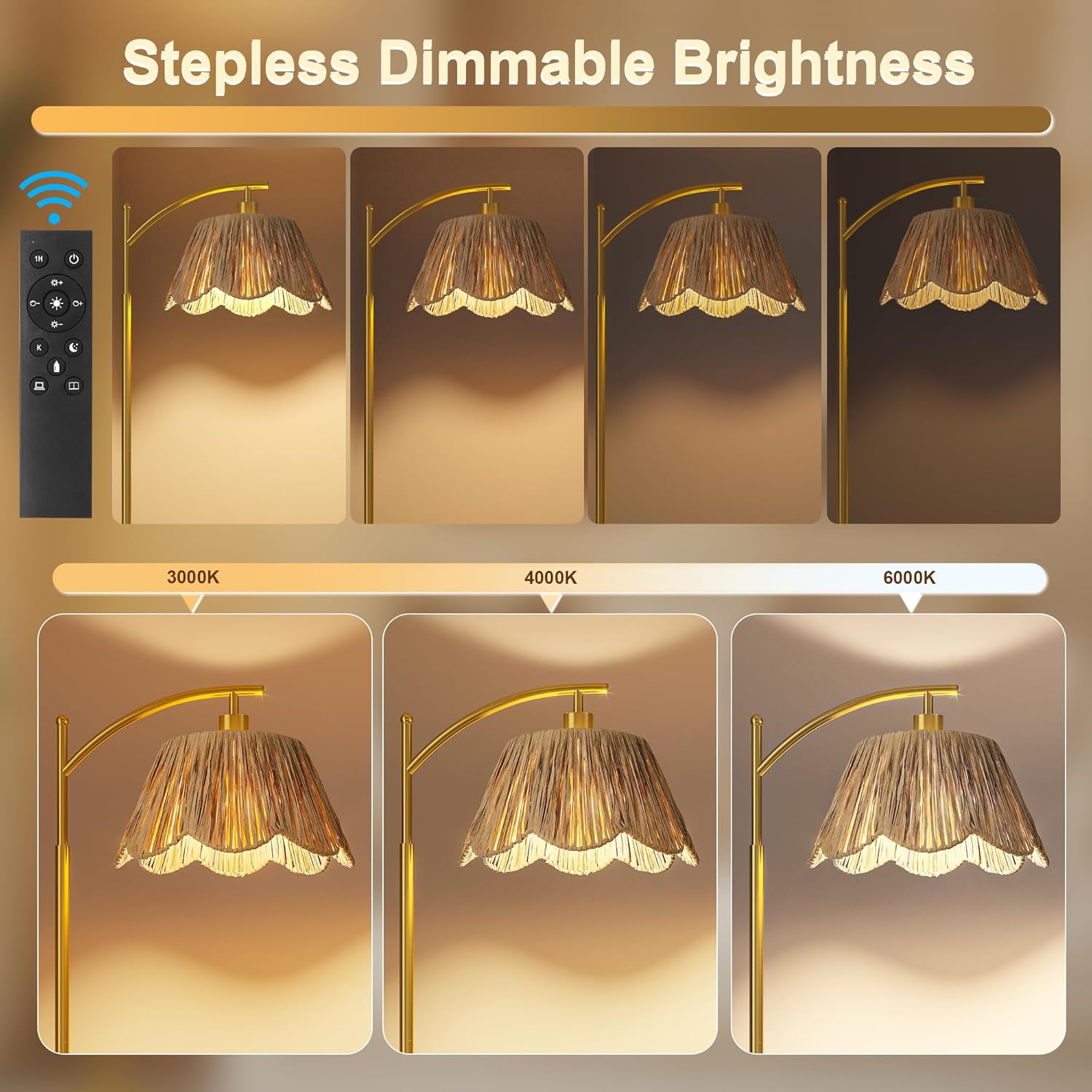 - 【Stepless Dimmable & 3 Color Temperatures】Saving your time to look for compatible bulbs, Our rattan floor lamp comes with an E26 smart bulb, which supports stepless brightness (1%-100%) and 3 color temperatures (3000K-6000K)and timer settings(1hour)as needed, This dimmable floor lamp also have pre-set modes offering various scenes such as: read, nursery, work and night light.The memory function can help you remember the last setting.