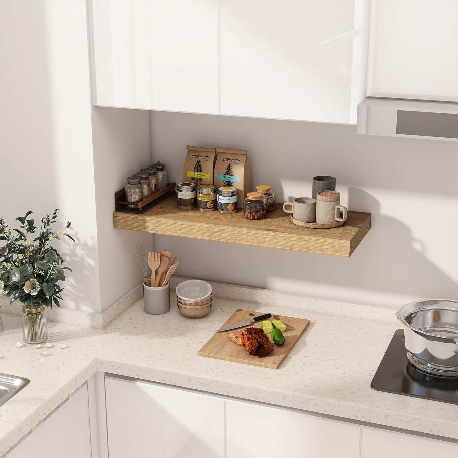 - ćFARMHOUSE RUSTIC WALL SHELFćThese floating shelves are made of premium engineered wood board and invisible one-piece bracket. The rustic wooden grain surface add character and warmth to any modern or traditional interior with these thick floating shelves, contrast shelves at staggering heights on the wall or mount side-by-side or in the corner for a clean streamlined look.