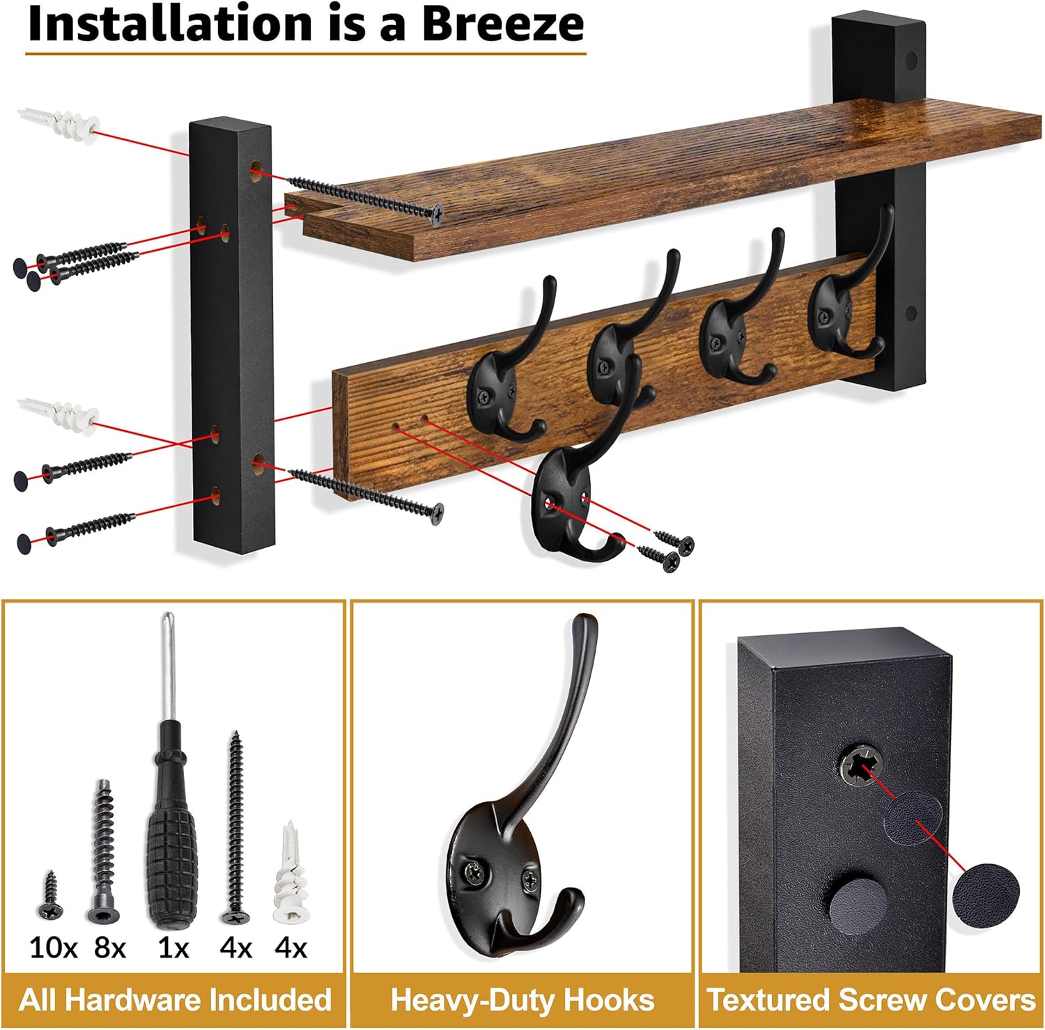 - Easy Installation, All Hardware Included – Labeled parts and step-by-step instructions make installation a breeze. Comes with screws, drywall anchors, mini level, screwdriver, and textured screw covering stickers for a clean finish. Measures approximately 23.6 L x 7.5 W x 4.7 D.
