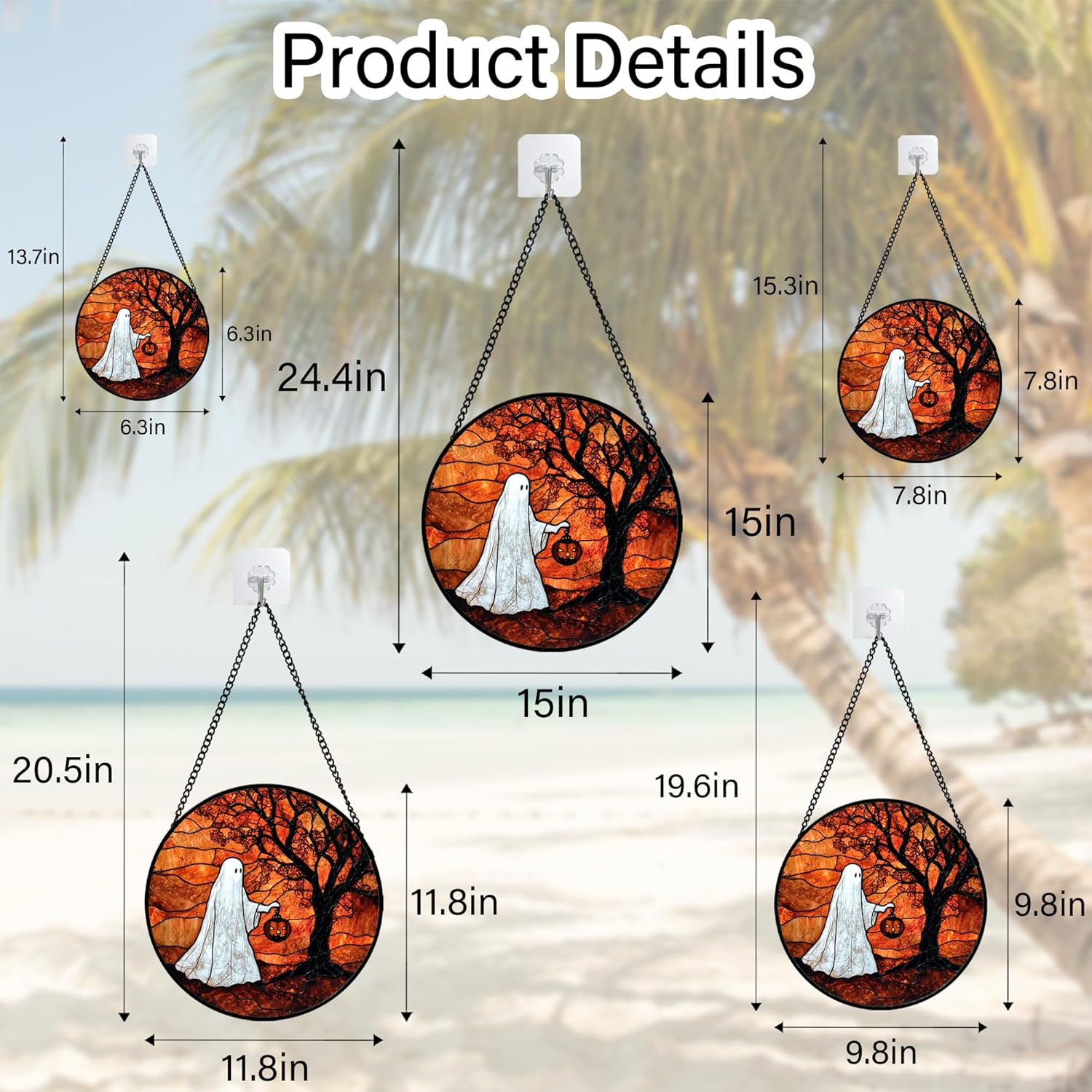 Stained Glass Window Hanging - Halloween Ghost Holding A Pumpkin Lantern Suncatcher for Door Garden Spooky Tree Sun Catchers Gothic Decorations Horror Gifts for Women Men Friend 15 in