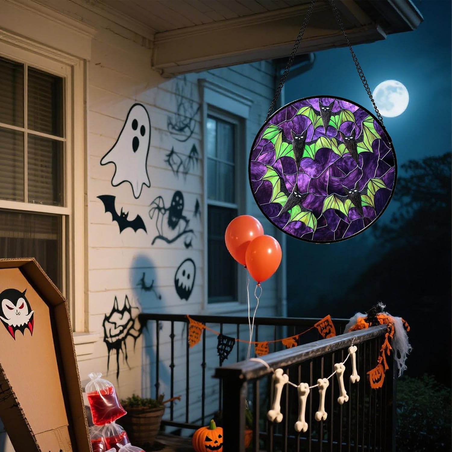 Stained Glass Window Hanging - Halloween Decorations Black Bat with Green Wings Suncatcher for Doors Garden Indoor Spooky Sun Catchers Gothic Decor Horror Gifts for Women Men Friend 15 in