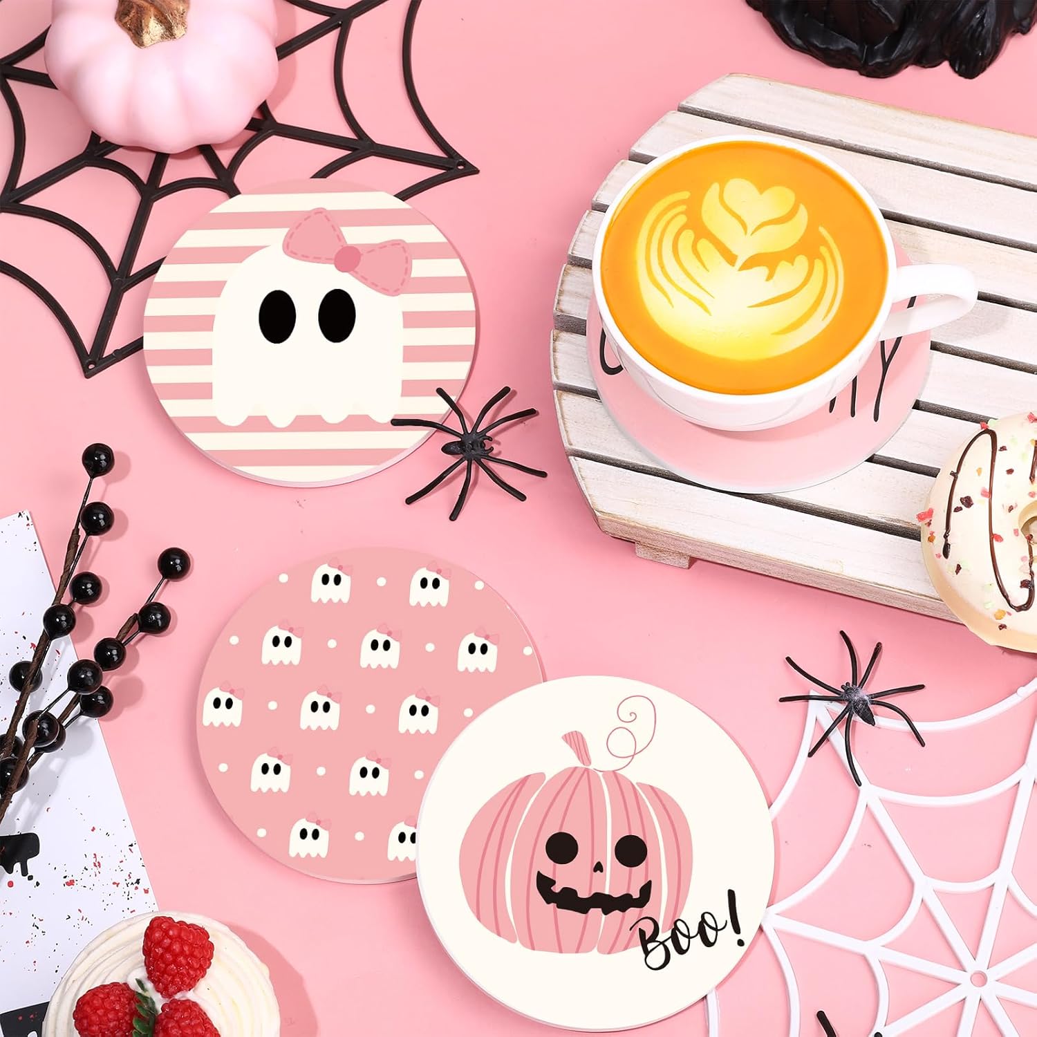 - Halloween Design: Our coasters are designed with Halloween pumpkin, spooky ghost and pink stripe patterns, etc., which will be the perfect complement to your holiday and everyday table decor