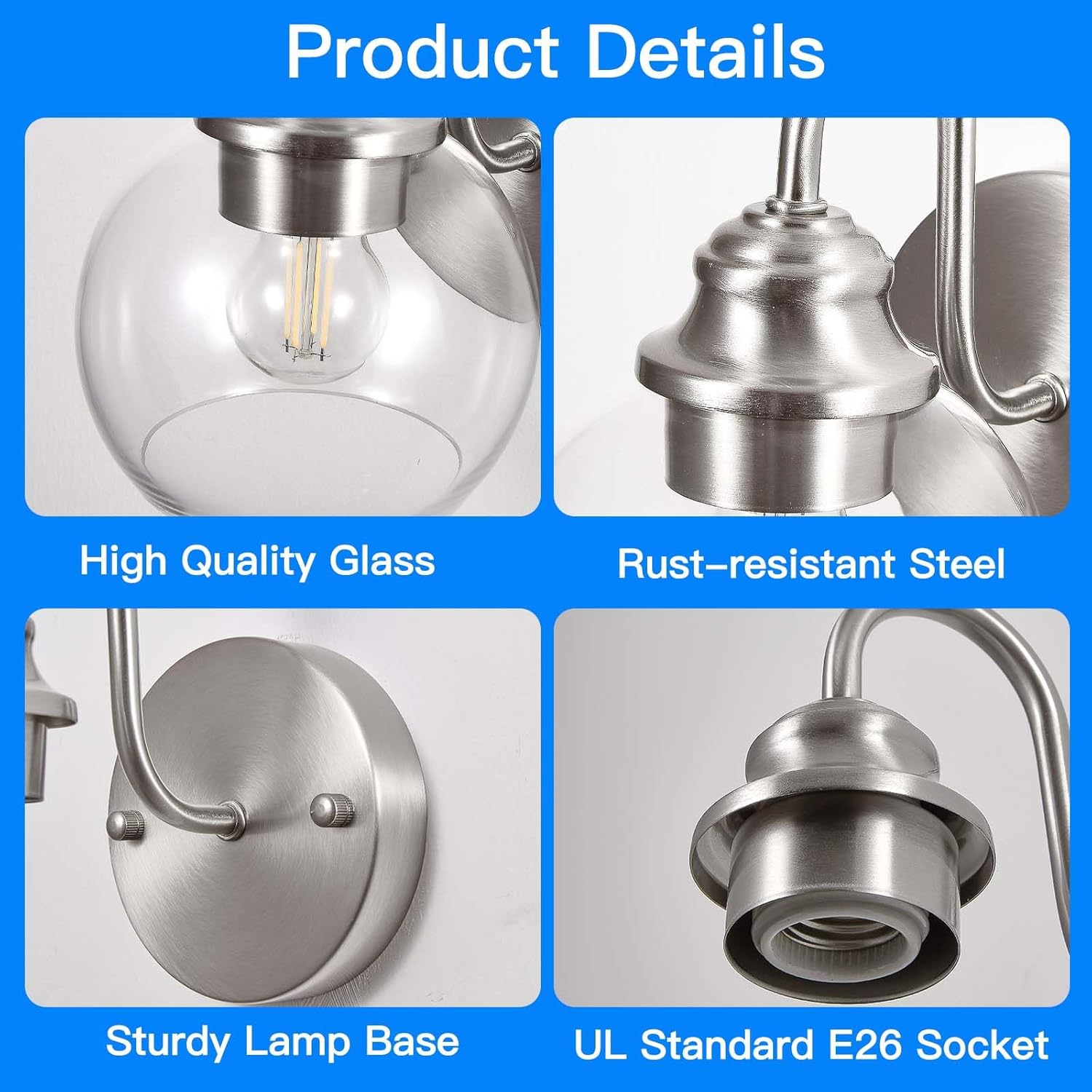 - [Excellent wall lamps]: Two sets of wall lamps are composed of transparent glass lampshades and metal bases. The transparent glass lampshades ensure good light transmittance. The gooseneck design not only restores the classic farmhouse style but also brings a touch of tenderness to your space, making it less rigid. The manufacturing process of brushed nickel metal paint ensures that the wall lamps will not oxidize or fade.