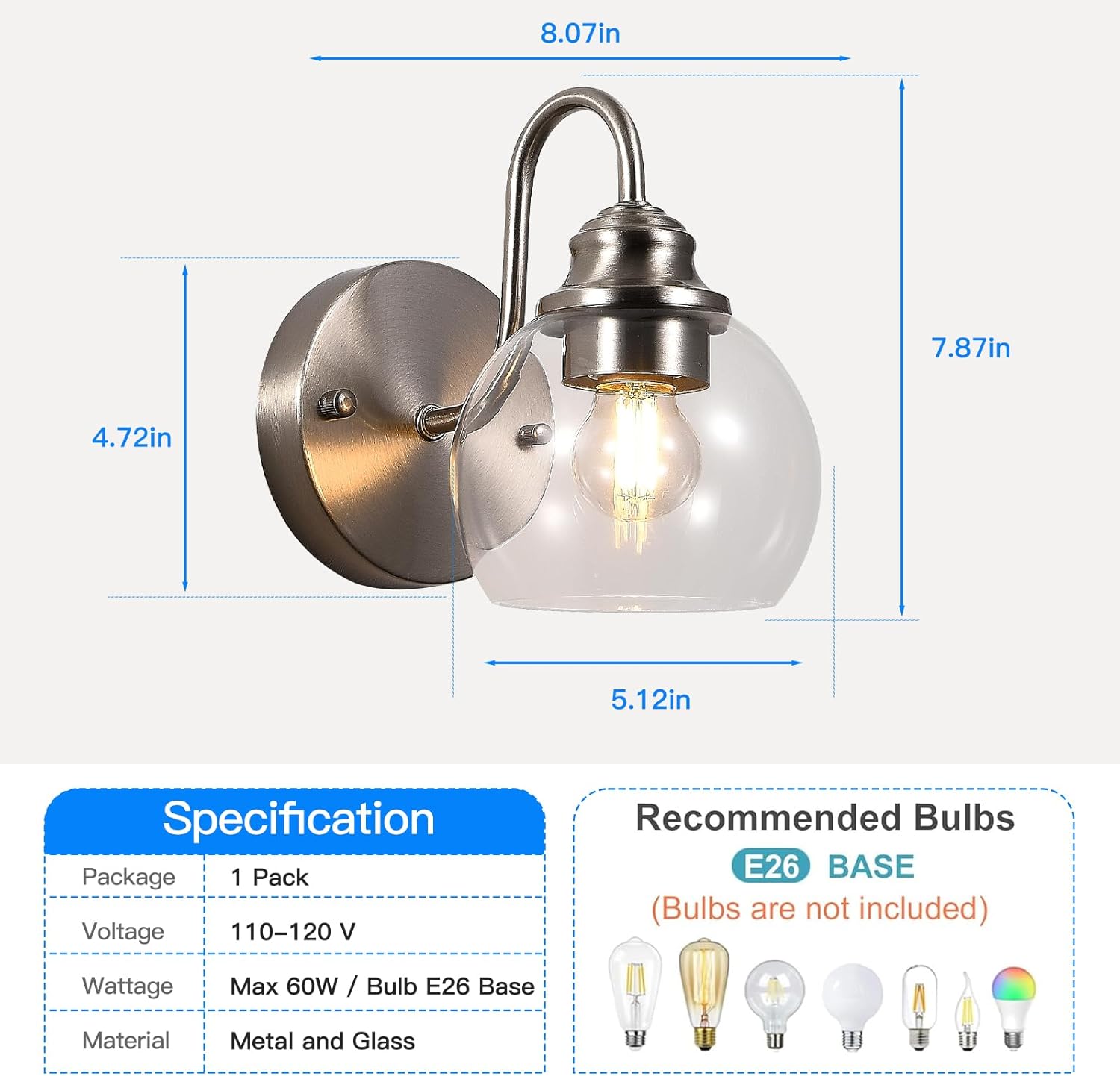 - 【Standard E26 Base】: Our bath vanity light fixtures set require 2 x E26 medium base bulbs (Max 60W for each light, Bulbs not included). This wall lamp areCompatible with smart bulbs and dimming bulbs (without smart and dimming functions). 2700K warm white bulbs brings you relaxing and welcoming feeling, however 5000K daylight white bulb give you clean and energetic enjoyment (Max. 60W, Hardwire 120V)