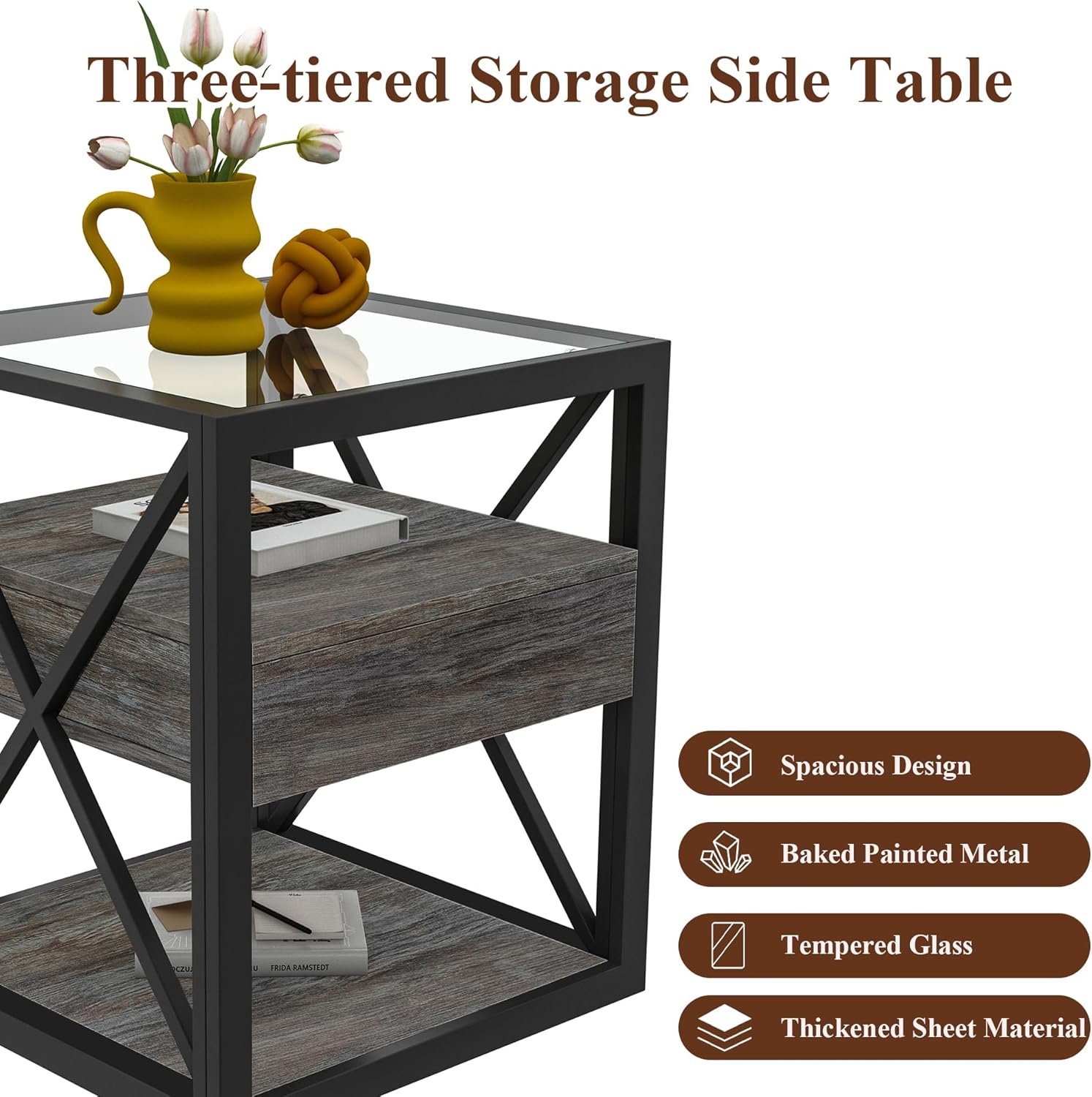Farmhouse End Table Set of 2, Modern Side Table with Drawer&3-Tier Storage Shelf, Square Rustic Nightstand, Accent Tea Table, for Bedroom Office Living Room, Grey, Natural Wood, Glass, Metal