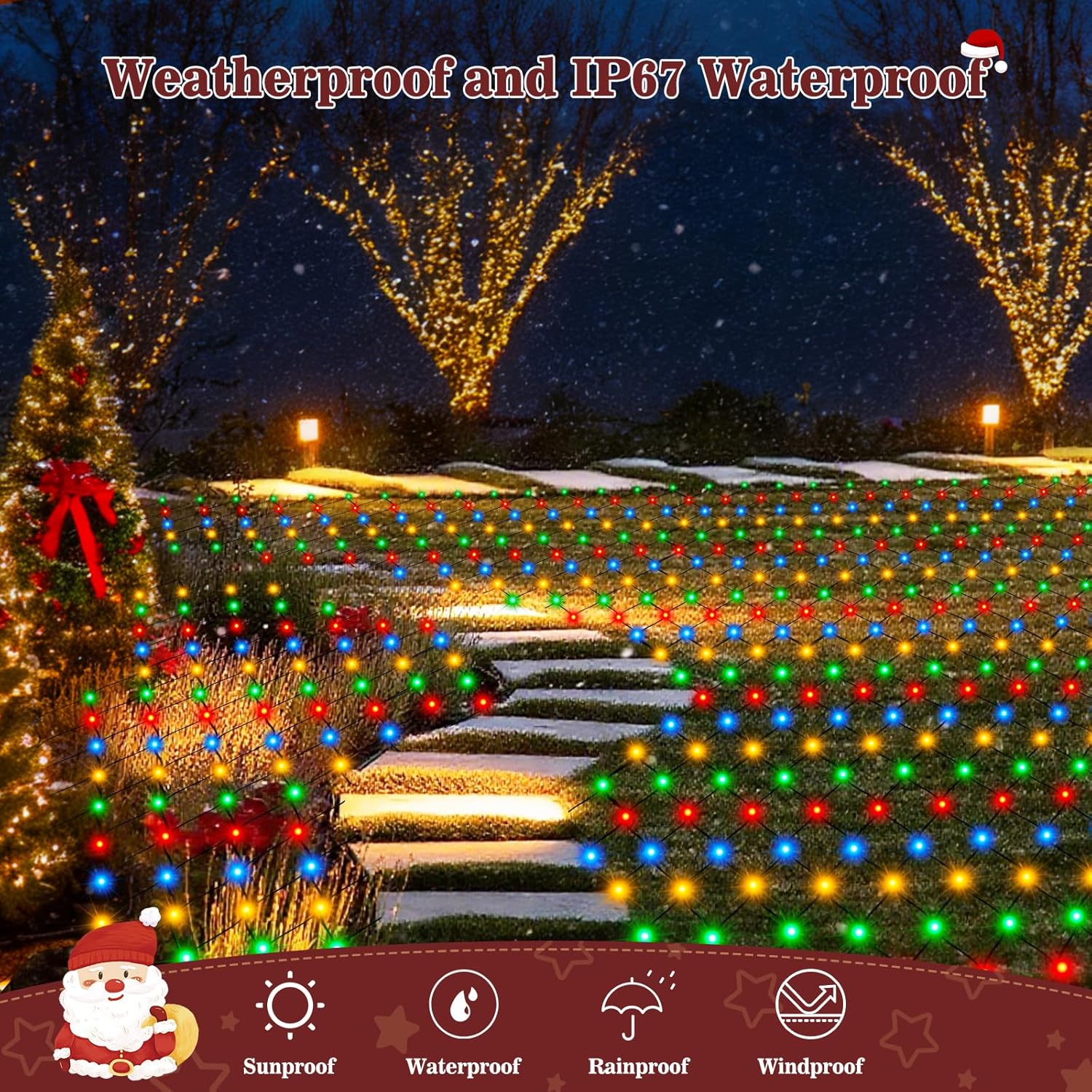 - 【IP67 Waterproof & All-Weather Durability】Newly IP67 waterproof Christmas net lights withstand heavy rain, snow, and winds. 2025 mesh lights housing feature waterproof construction, designed for year-round use in all weather conditions to ensure reliable and durable outdoor performance(Please be attention: the plug is not waterproof, please keep the plug away from water)