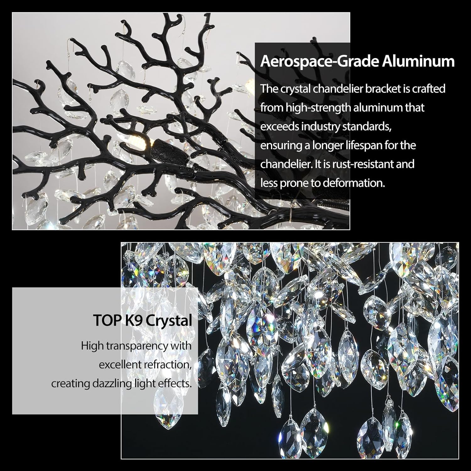 - Modern Black Crystal Tree Branch Chandelier:Crystal chandelier crafted with exquisite black decorative branches and stunning TOP K9 transparent crystals that evoke purity and romance,and crystal chandelier frame is made of aerospace-grade aluminum alloy.The chandelier is resistant to rust and deformation, ensuring long-lasting use. Tested to last over 100,000 hours, our black crystal chandelier will continue to function perfectly. Additionally, it is not only a lighting fixture but also a piece of art.