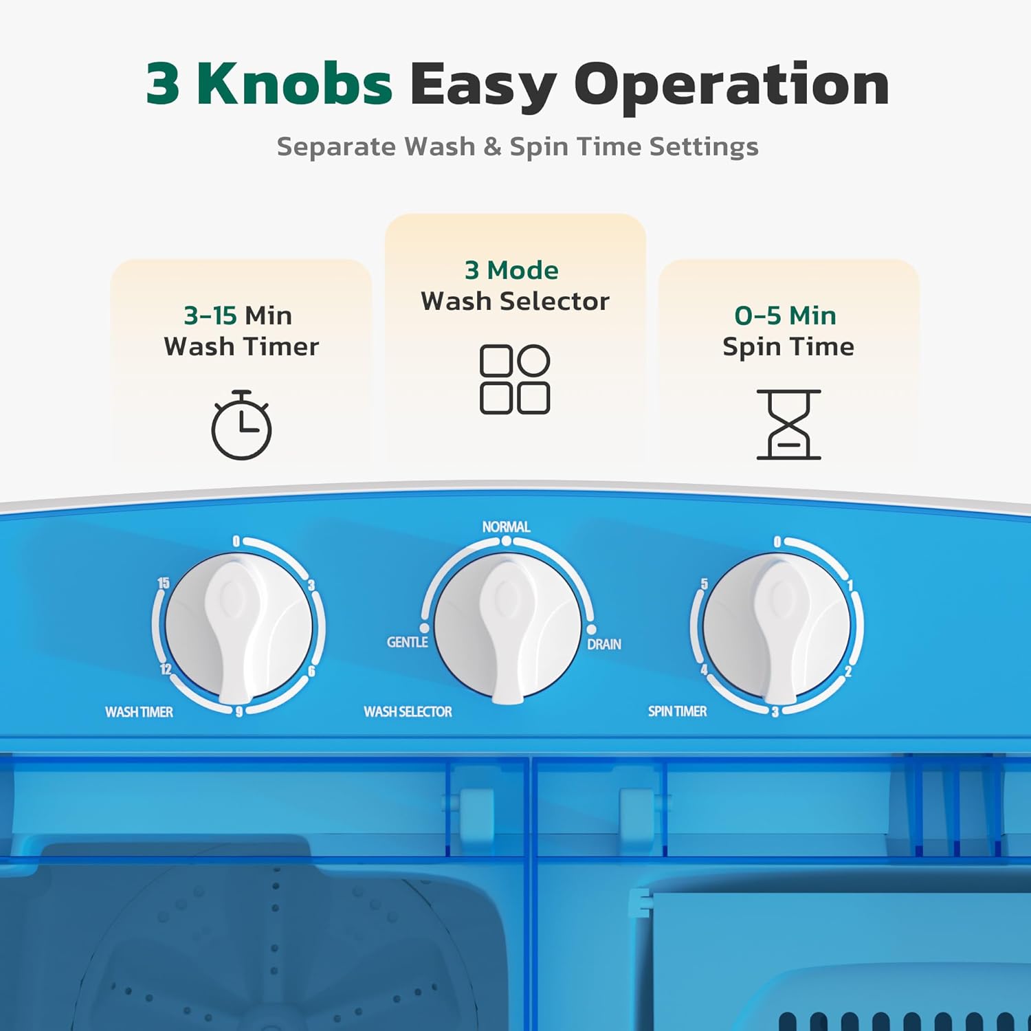 - [Easy to Operate]: Greenvelly portable washer dryer combo has three independent controls: wash timing (0-15 minutes), mode (gentle/standard/drain), and dehydration timing (0-5 minutes), which quickly completes washing and saves you valuable time.