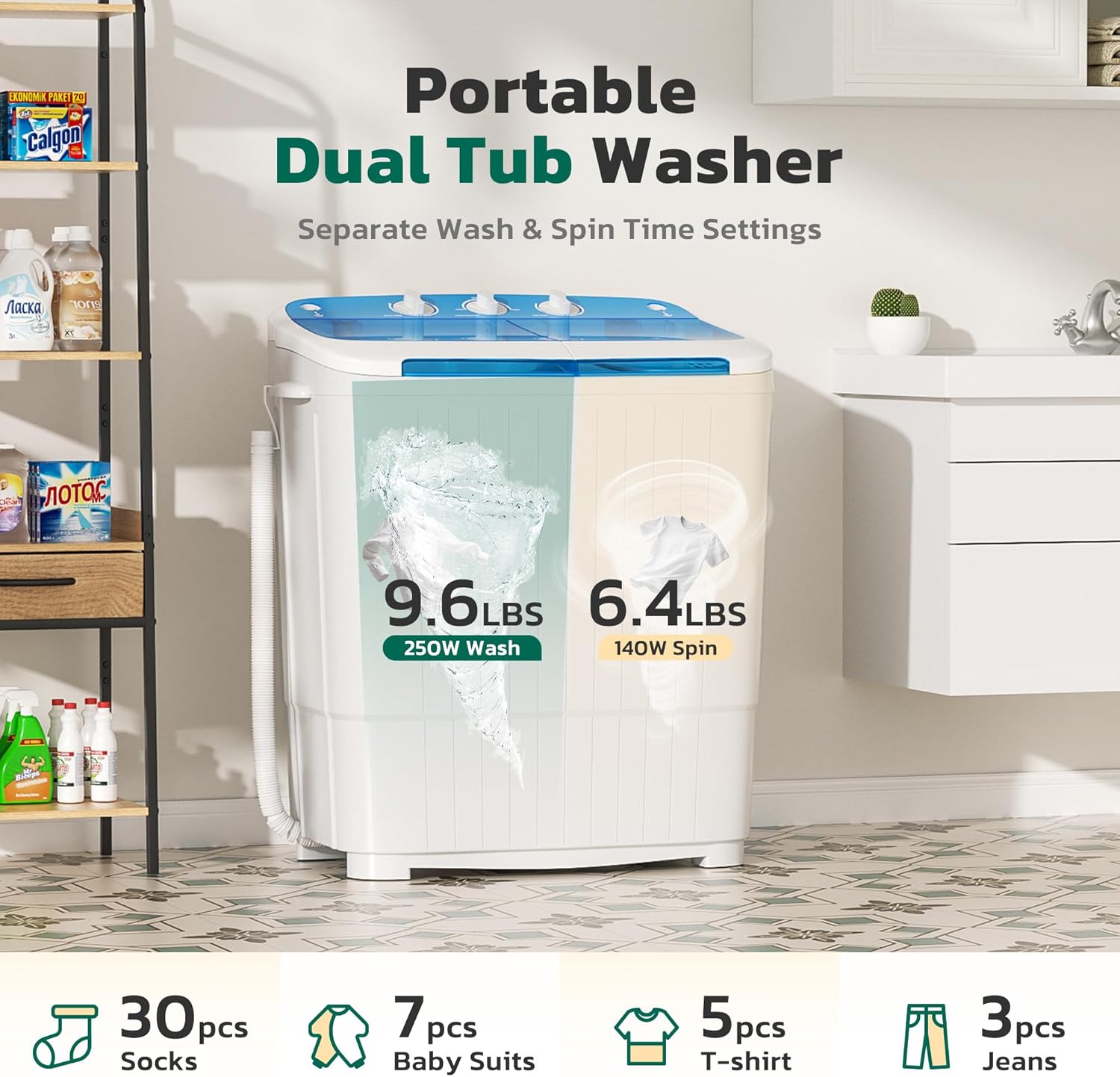 - [Twin Tub Design] Greenvelly portable washing machine adopts a dual bucket design, with a washing bucket (9.6Lbs) and a dewatering bucket (6.4Lbs) operating independently in different zones, allowing for simultaneous cleaning and spin drying. The transparent top cover facilitates real-time monitoring of the washing status. This washing machine is suitable for bathrooms, dormitories, apartments, RVs, and other places.