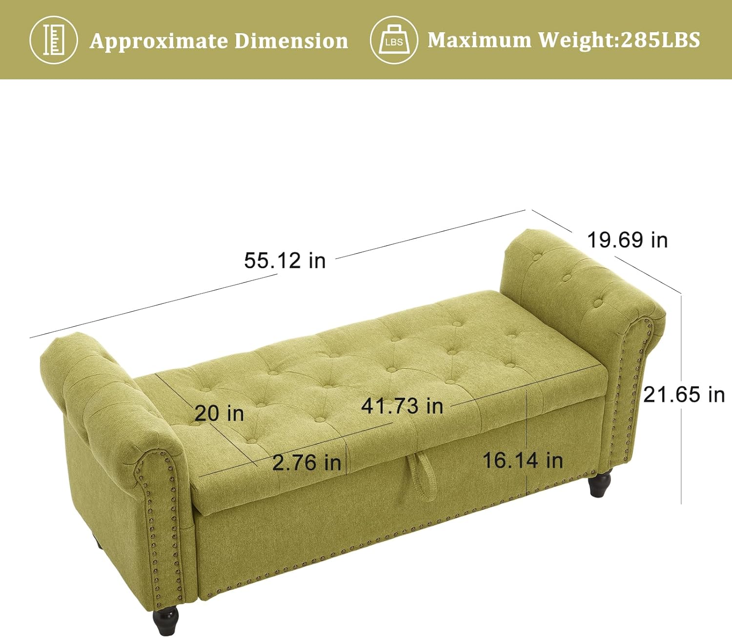 Furniliving 55” End of Bed Bench, Bedroom Bench with Button-Tufted, Large Upholstered Storage Ottoman Benches Entryway Bench with Storage Shoe Cabinet Bench, for Bedroom, Living Room, Linen, Green