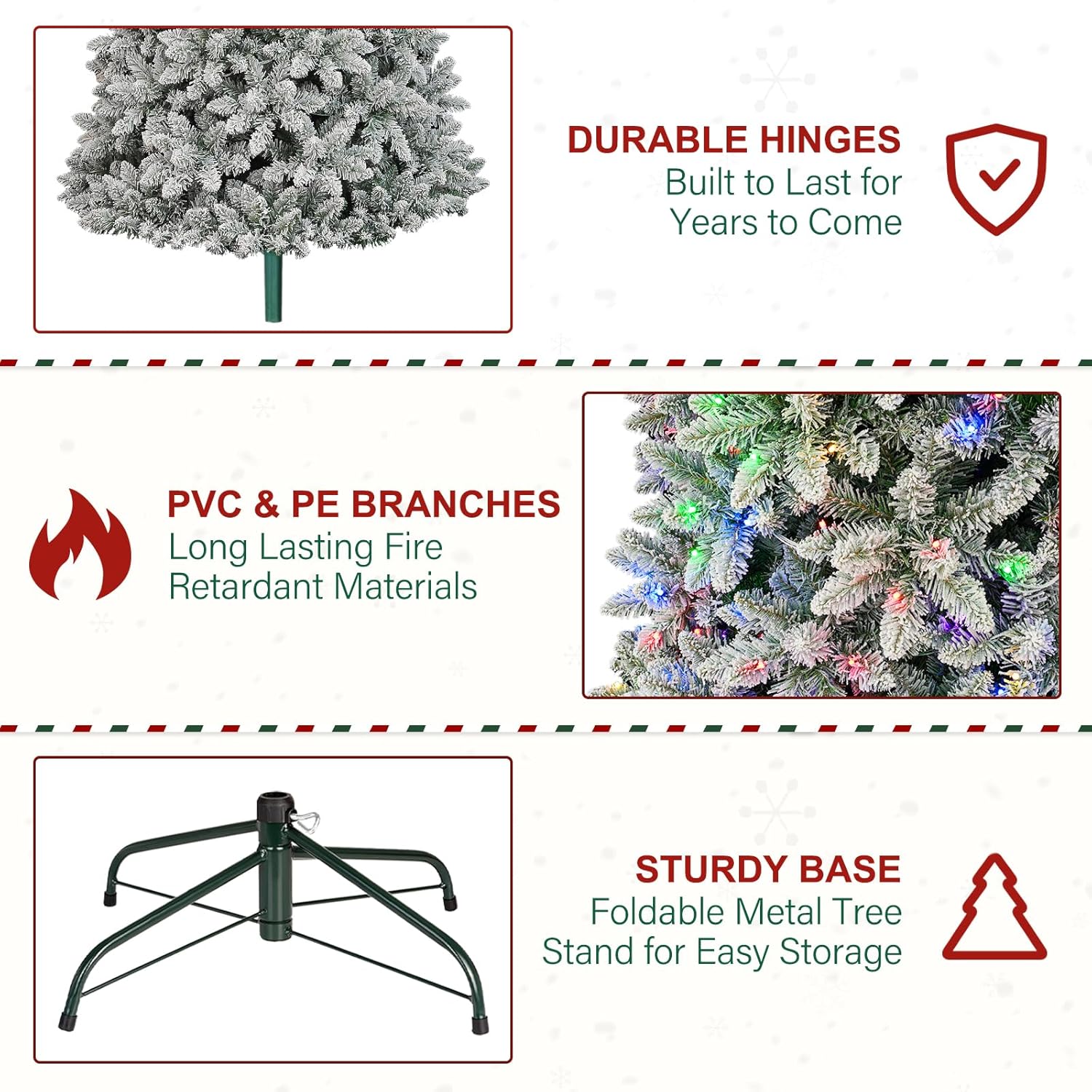 7.5ft Lighted Snow Flocked Christmas Tree with Remote Control, 450 Multi-Color RGB Lights, 1446 PVC Branch Tips, 15 Mode Artificial Hinged Christmas Tree for Home