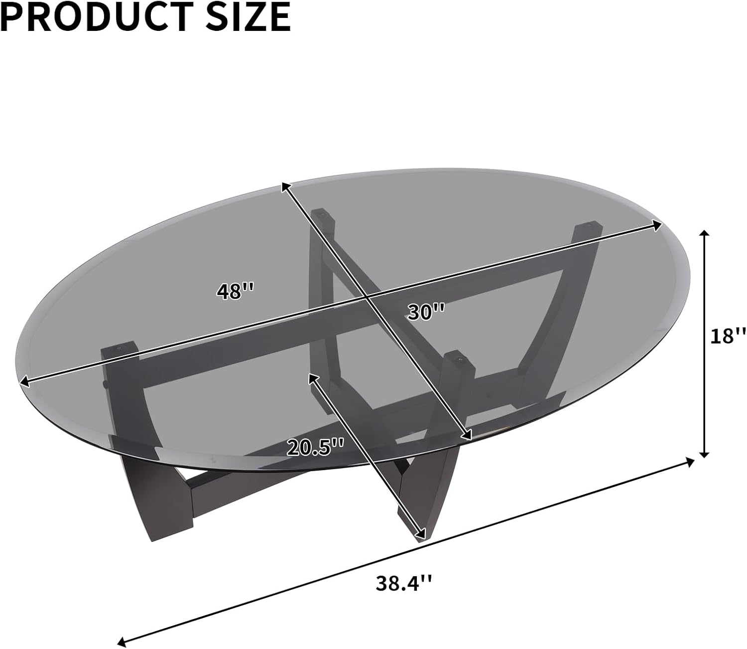48" Oval Glass Coffee Table with Black Tempered Glass Top Cross and Solid Wood Base Simple & Modern Center Table for Living Room Office Apartment Black